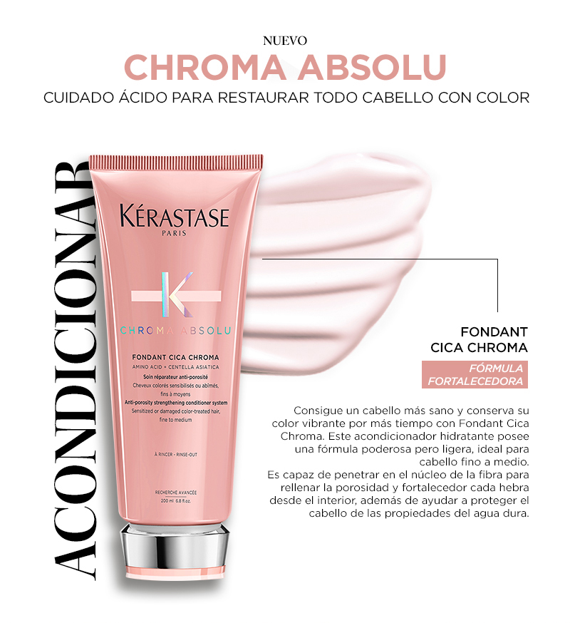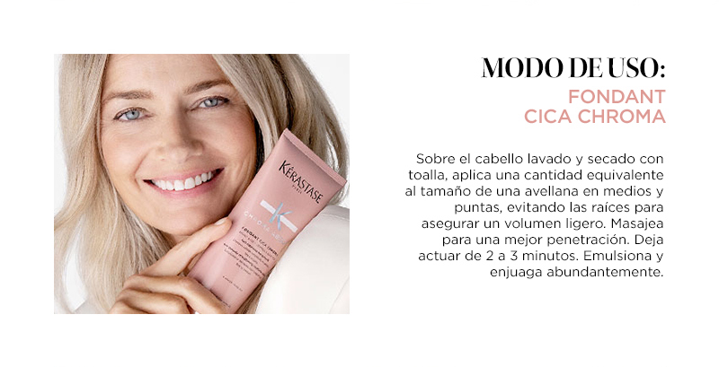 | Instrucciones de Uso | Acondicionador Fondant Cica Chroma 200 ml: Aplicar 10 ml sobre cabello húmedo secado con toalla. Realizar un suave mensaje de medios a puntas. Dejar actuar por 2 ó 3 minutos. Emulsionar y enjuagar. |