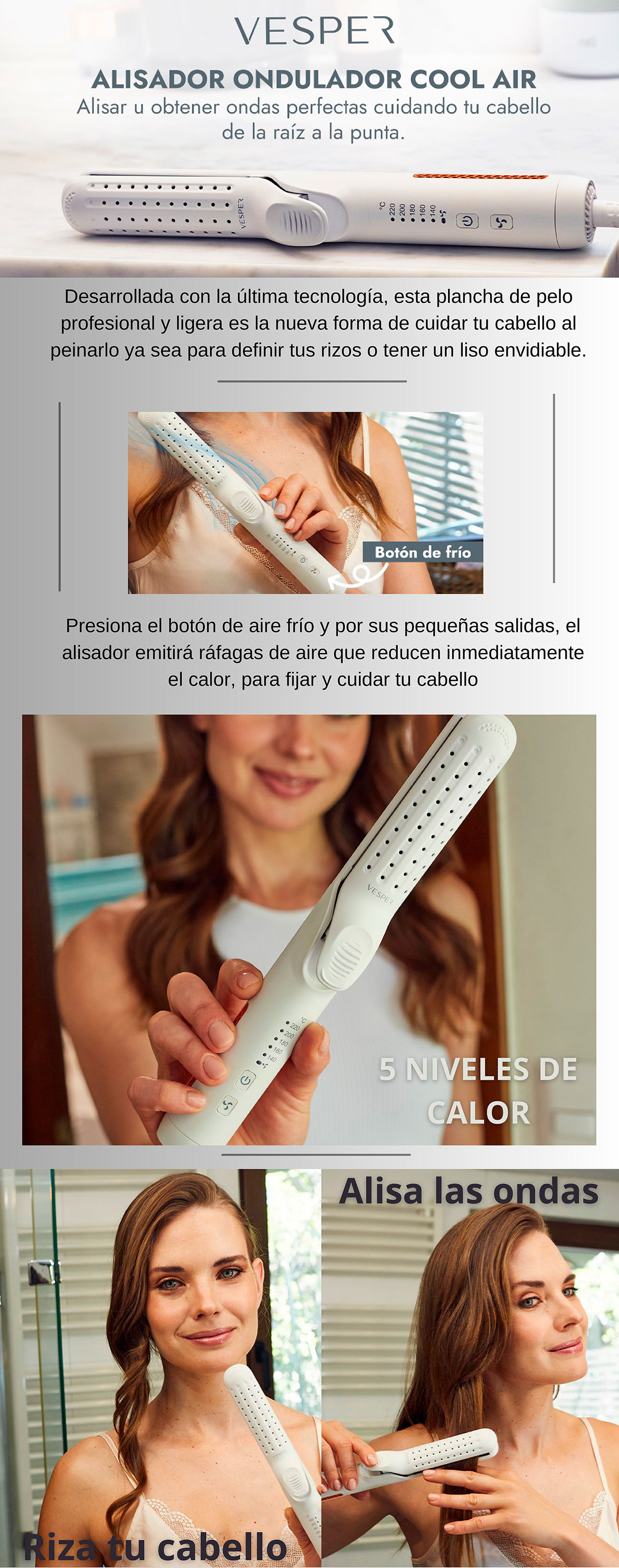 | Más Información | La alisadora 2 en 1 te brinda la mejor experiencia de alisado y protección para tu cabello. Cuenta con un cable de 2.5 metros giratorio para mejor manejo al momento de peinarte |