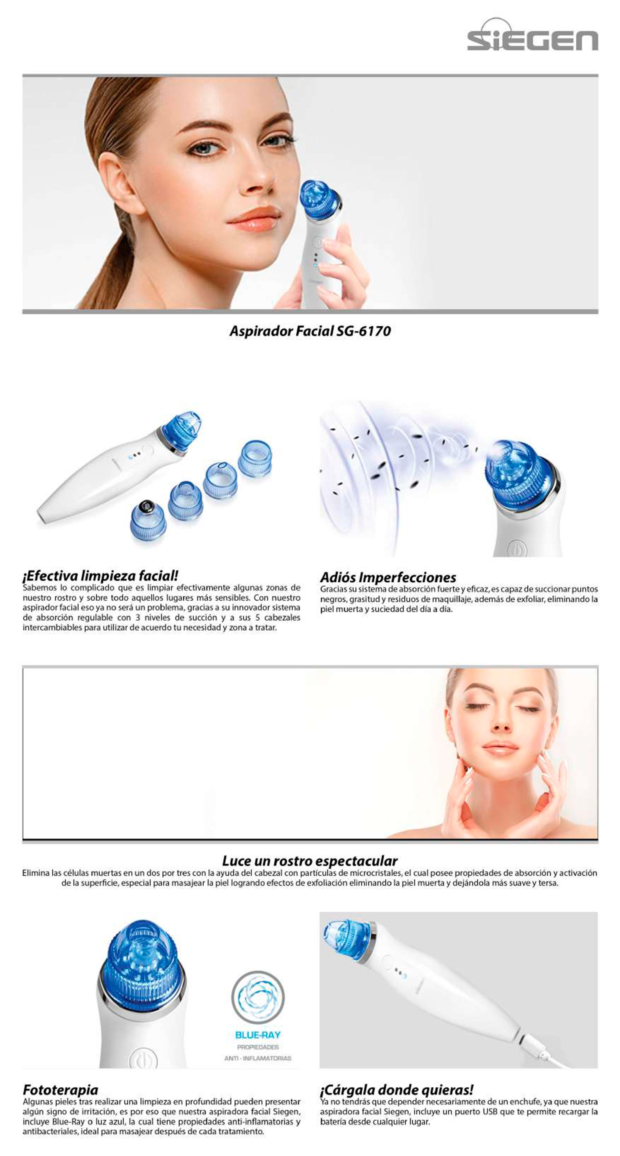 | Más Información | Innovador sistema de absorción regulable, fuerte y eficaz capaz de succionar puntos negros Blue Ray, luz azul con propiedades antiinflamatorias, profundidad de onda 415nm 5 cabezales intercambiables que se adaptan a cada tipo de piel: Cabezal con micro-cristales, propiedades de absorción especial para exfoliar Cabezal de succión fuerte, remueve puntos negros, grasitud y residuos Cabezal de succión precisa, perfecto para pieles y zonas mas sensible Cabezal ovalado, para líneas de expresión y arrugas Cabezal Blue-Ray , masajes con luz azul después de cada succión con efectos de esterilización bacterial y purificador facial 3 niveles de intensidad de succión Recargable, con puerto USB Tratamiento seguro, no invasivo y sin dolor Cabezales lavables Diseño ergonómico y liviano, cómodo para transportar RESULTADOS Limpieza facial profunda Aspira puntos negros Remueve exceso de grasa facial Previene el acné Exfolia eliminando piel muerta y suciedad Energiza los folículos pilosos Estimula el crecimiento del cabello Revierte el proceso de adelgazamiento del cabello Aumenta la densidad y plenitud del cabello Revitaliza y fortalece el cabello dañado |