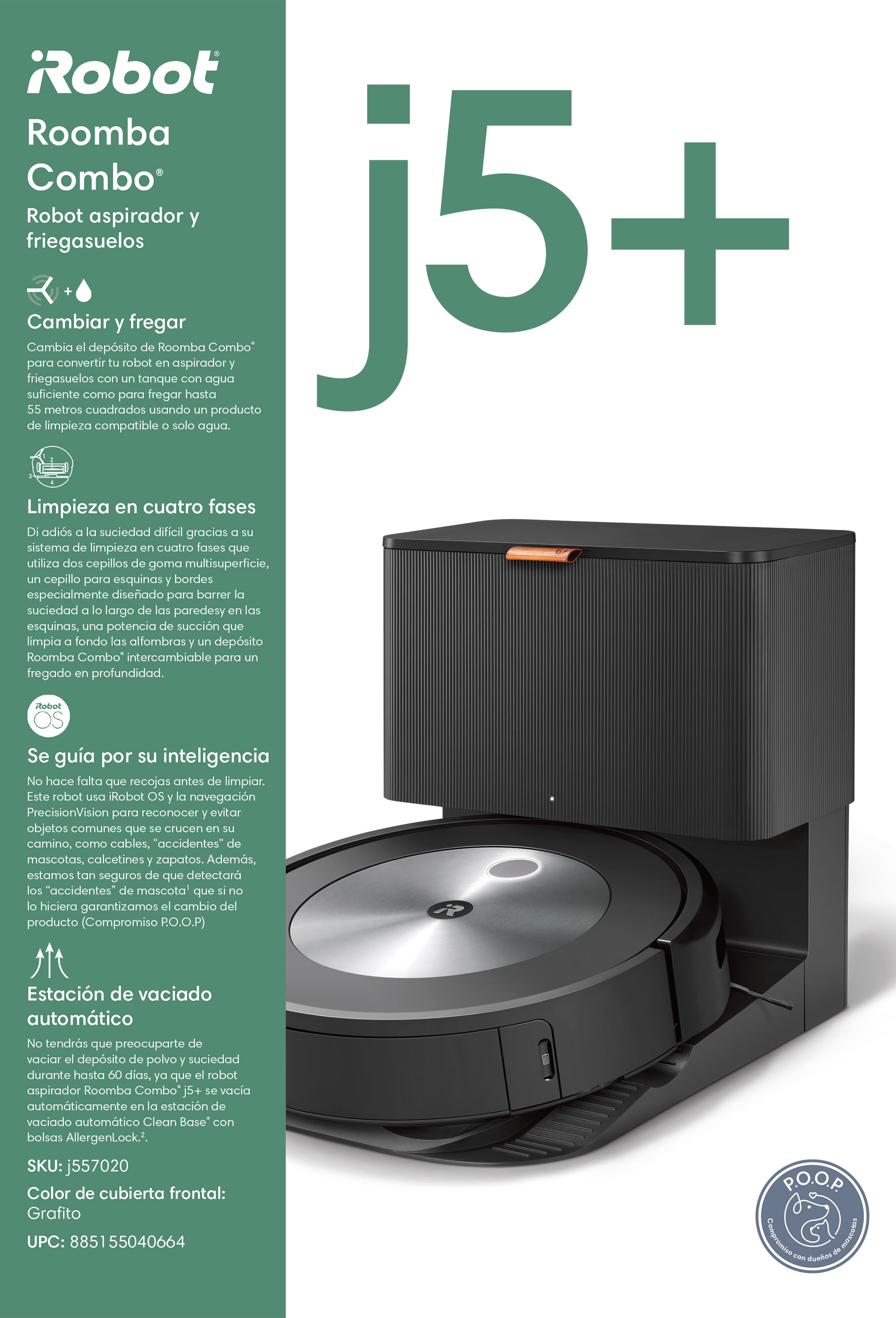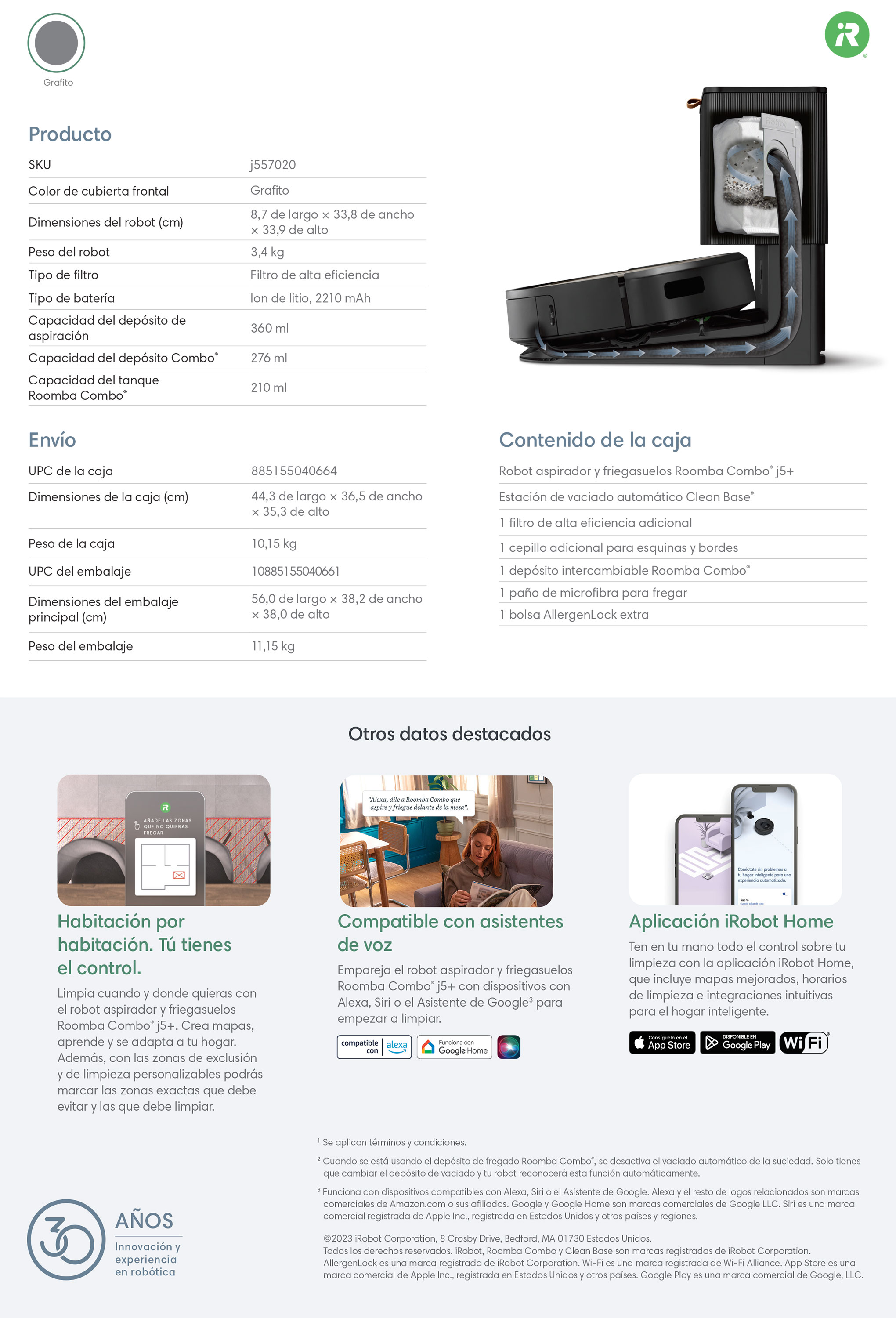 IncluyeRobot aspirador y trapeador Roomba Combo® j5+ + Estación de vaciado automático Clean Base® + 1 filtro de alta eficiencia adicional + 1 cepillo adicional para esquinas y bordes + 1 depósito intercambiable Roomba Combo® + 1 paño de microfibra para fregar + 1 bolsa AllergenLock extra