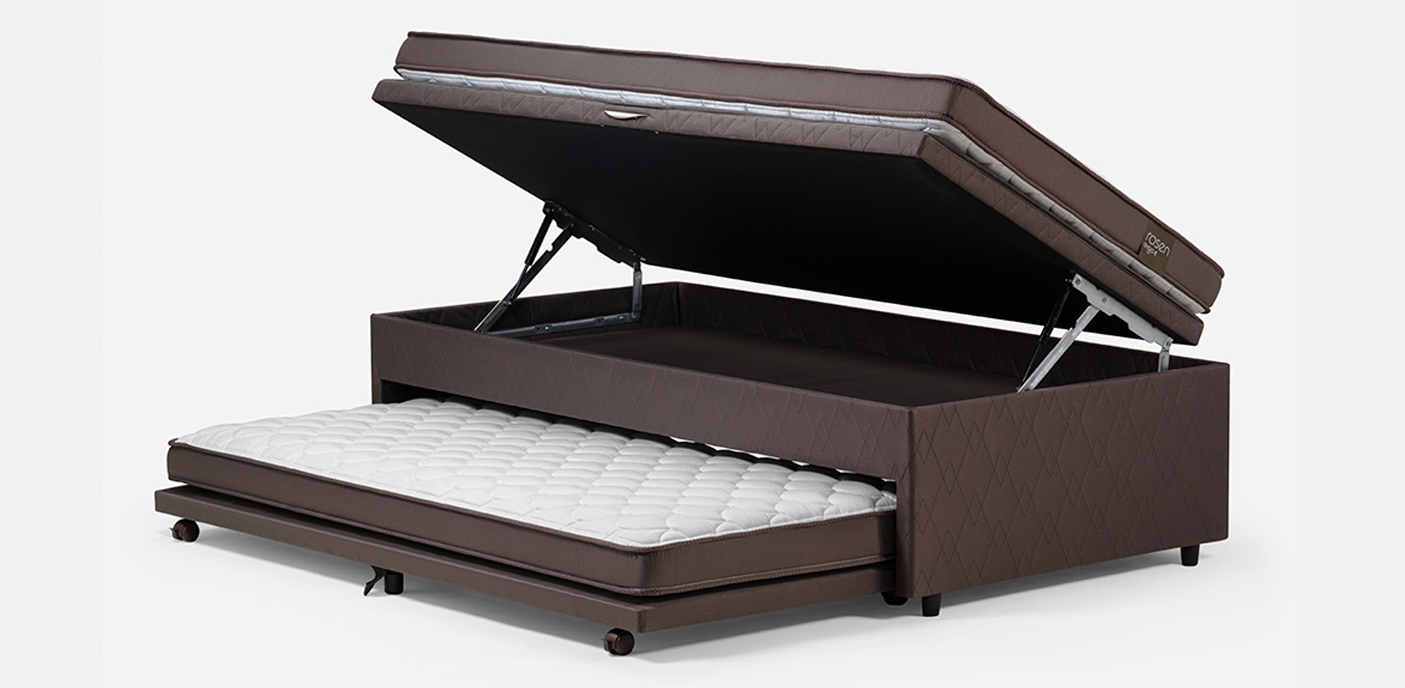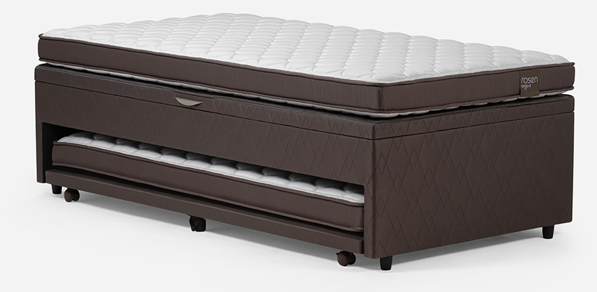 El Bed Boxet Rosen Ergo T es la combinación perfecta entre almacenamiento y optimización de los espacios, ya que es un diván cama que además cuenta con un espacio de almacenaje en la cama superior. Los colchones están compuestos por resortes Bonell que entregan una respuesta independiente y permiten la correcta adaptación al tamaño y peso del cuerpo. Además cuentan con un marco de poliuretano que mantiene la estructura y permite mayor ventilación, logrando una regulación óptima de la temperatura. La funda es de tela Jaquard belga, muy durable, resistente y de gran suavidad al tacto. La estructura de este bed boxet es de madera con tela Jacquard y posee tela antideslizante en la cubierta para evitar deslizamientos, un sistema mecánico para abrir y cerrar fácilmente y ruedas en la cama auxiliar para un desplazamiento simple.
