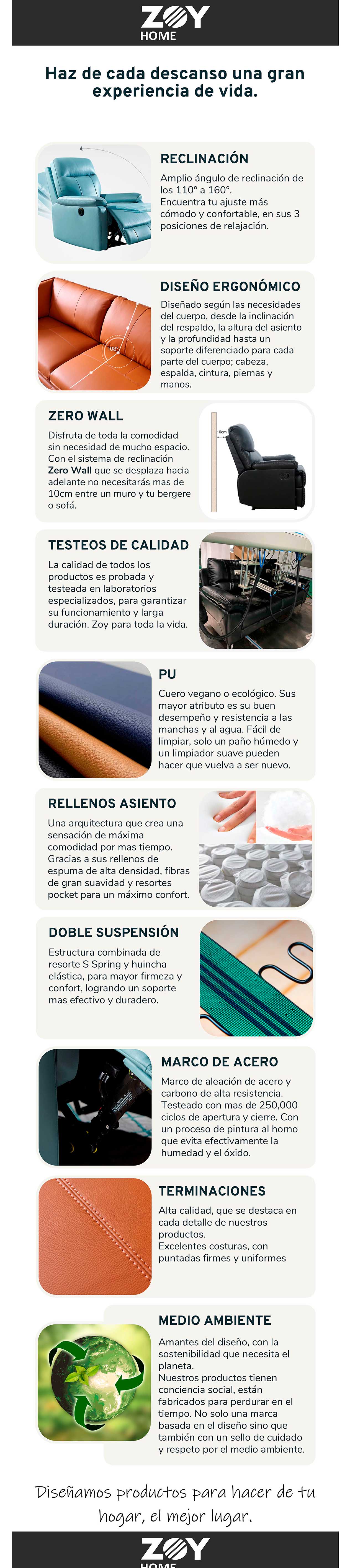 | Más Información | Giratorio y Mecedora. Masajeador 8 puntos y función de calor, con control de mando. Posavasos. Zona de guardado. Mecanismo de reclinación manual "pull cable" de 105° a 160°. Resorte pocket en cojines y resorte zigzag en la base del asiento. Tipo de reclinación "Zero Wall", necesitas pocos centímetros entre la pared y el producto para accionar el reclinado y encontrar tu posición de descanso perfecta |