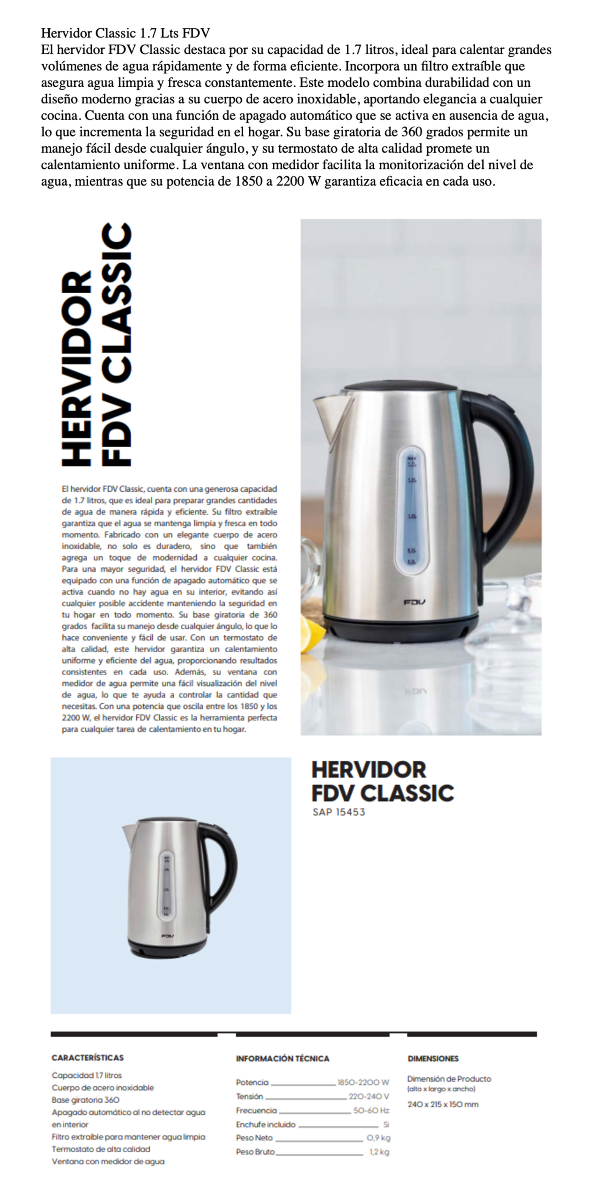 | Más Información | Base giratoria 360°, apagado automático al no detectar agua en interior, filtro extraíble para mantener agua limpia, termostato de alta calidad, ventana con medidor de agua |
