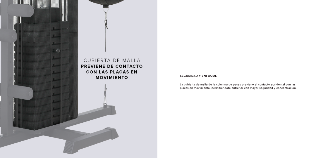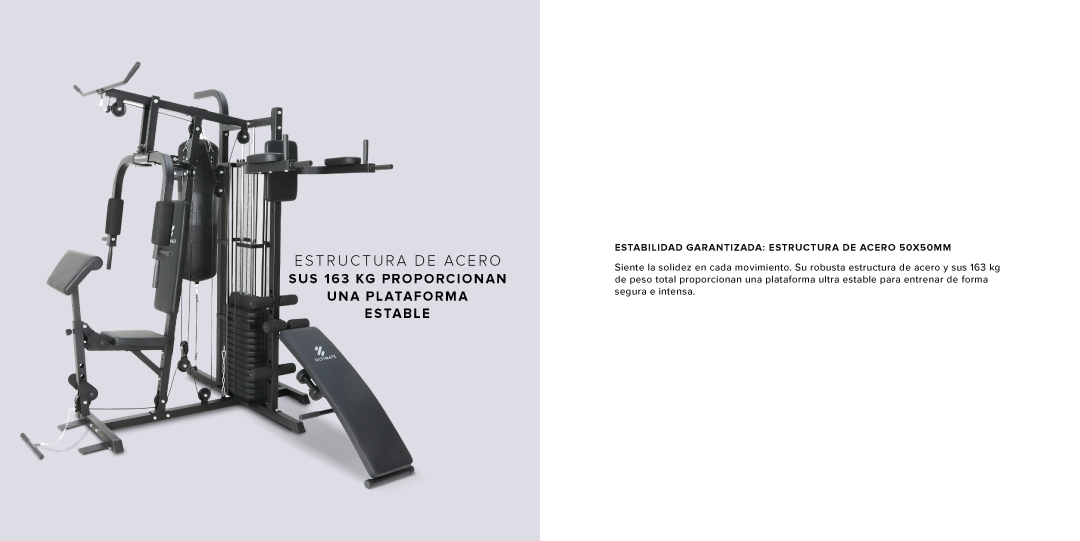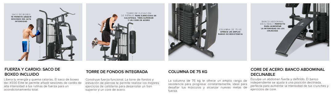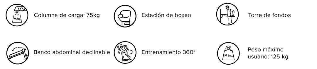 | Características | Esta estación todo en uno combina una potente columna de carga de 75 kg con estaciones dedicadas para boxeo, abdominales y fondos. |