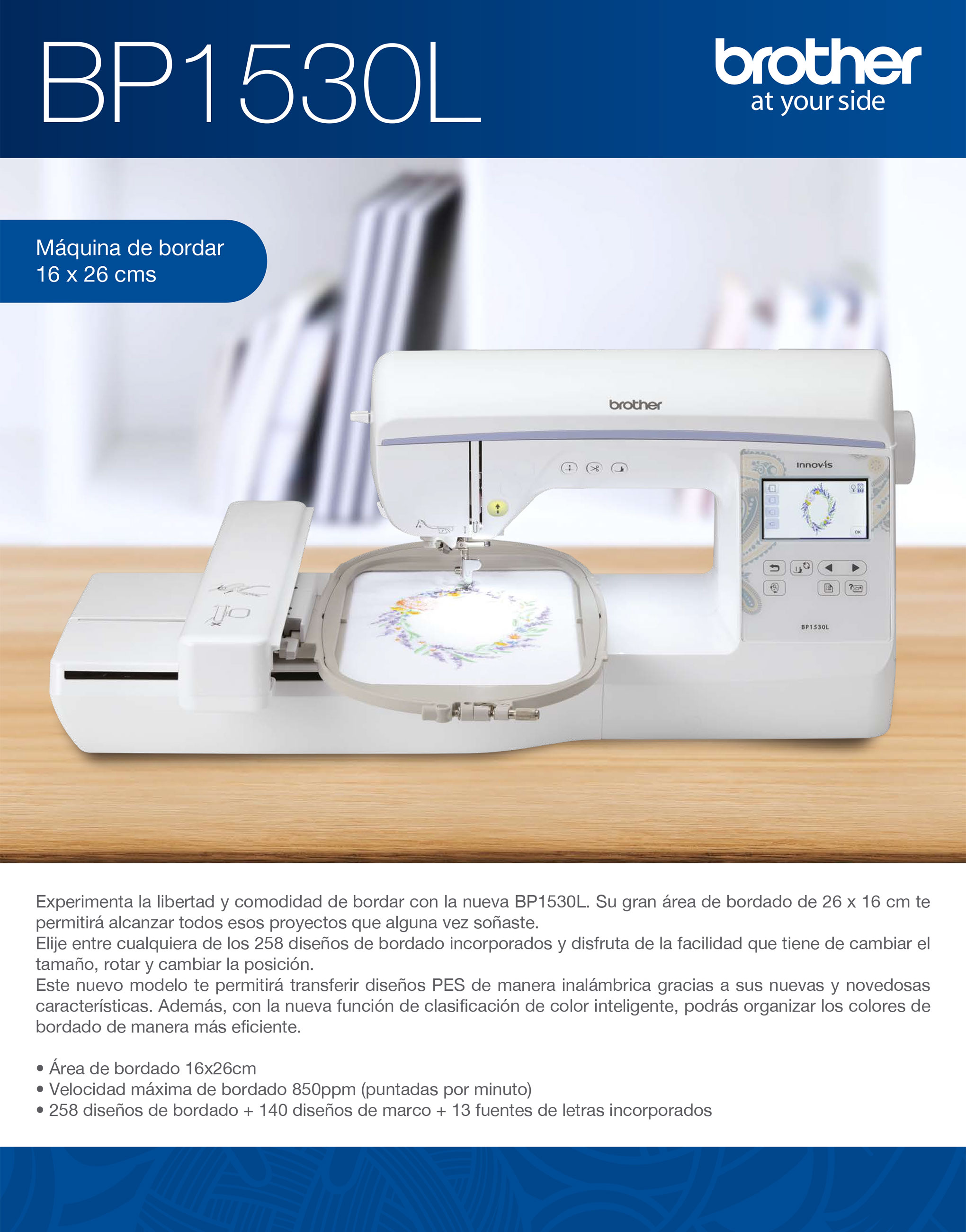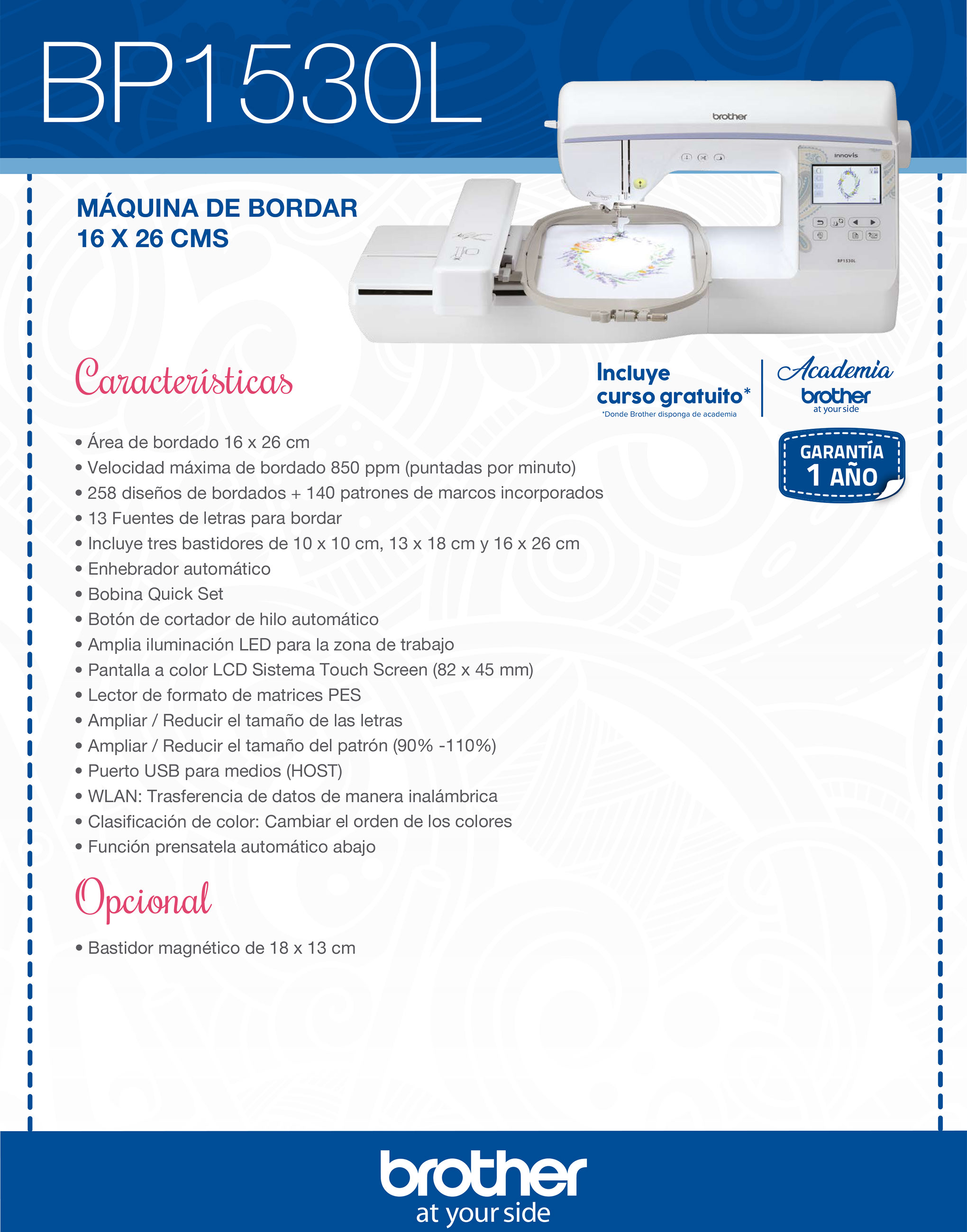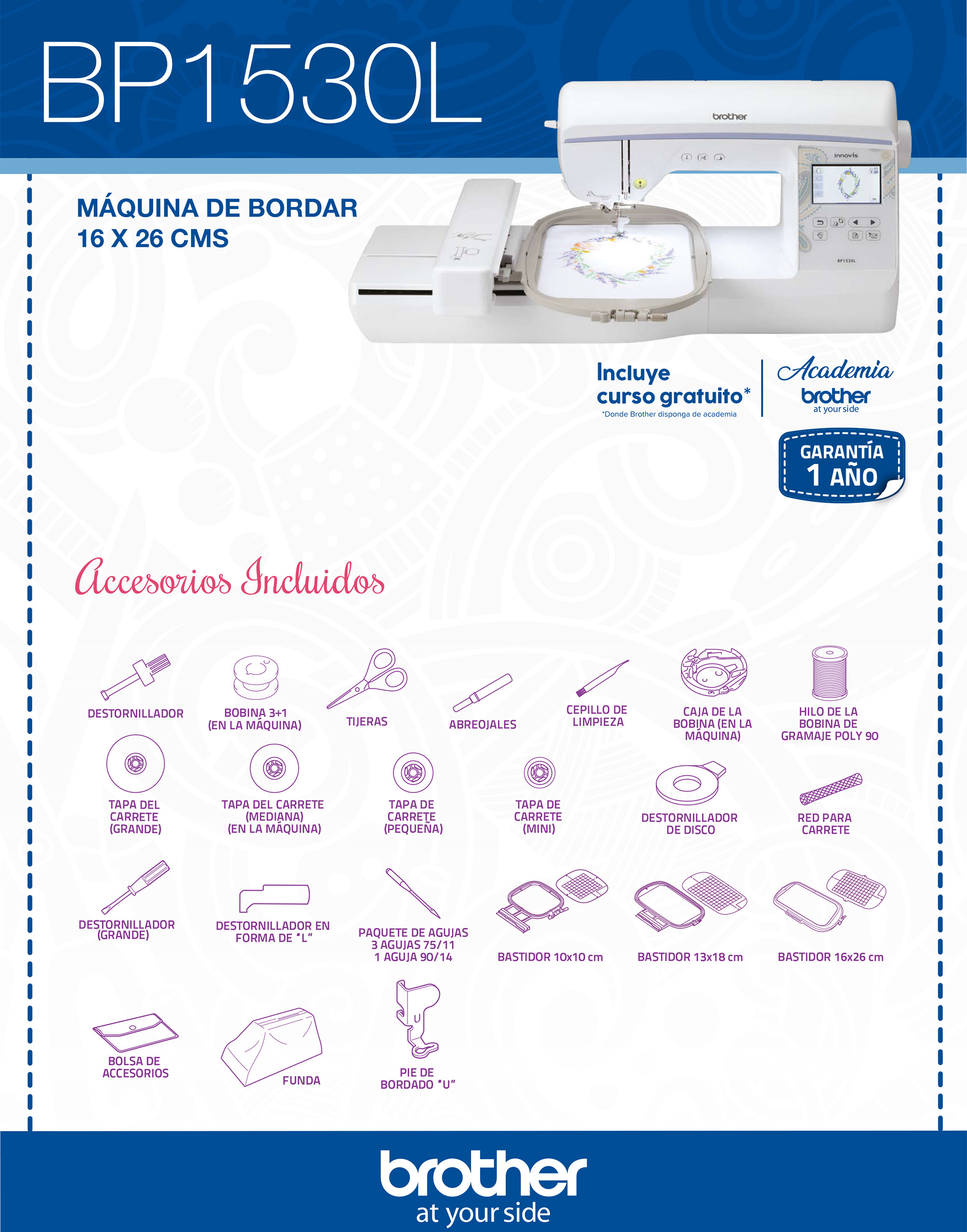 | Incluye | Bastidor 10 x 10 + Bastidor 13 x 18 + Bastidor 16 x 26 + 1 Bobina (En la máquina) + 3 x Bobinas + Hilo de bobina Gram POLY 90 + Pie Bordado "U" + Desatornillador Disco + Desatornillador + Destornillador "L" + Destornillador pequeño + Cepillo Limpieza + Tijeras + Abreojales + Paquete Agujas (3x 75/11 + 1x 90/14) + 1 aguja en máquina + Insercion Carrete del Hilo + Funda + Tapa Carrete Grande + Tapa Carrete Mediano + Tapa Carrete Pequeño + Tapa Carrete Mini + Bolsa Accesorios + Red para carrete + Caja de Bobina |