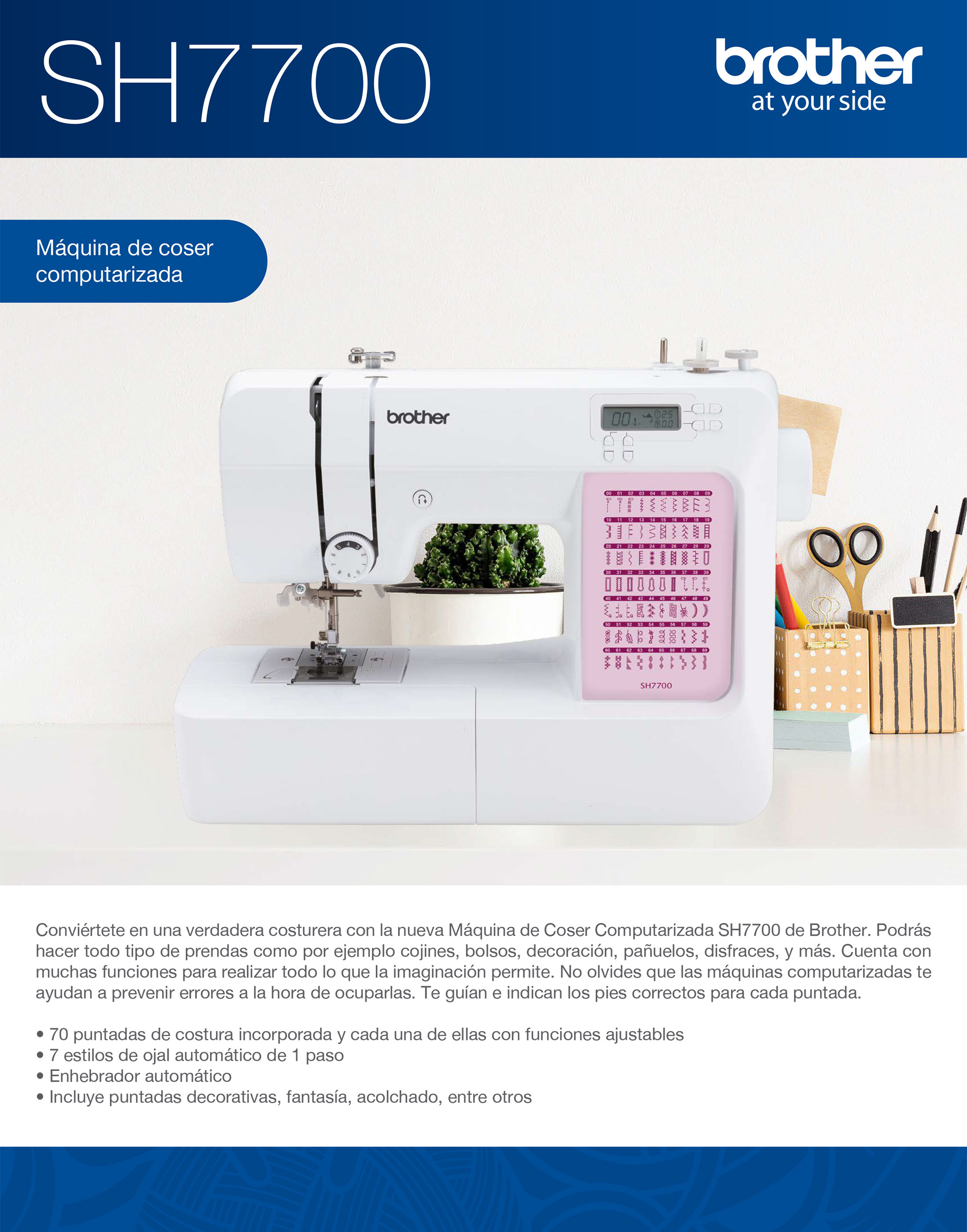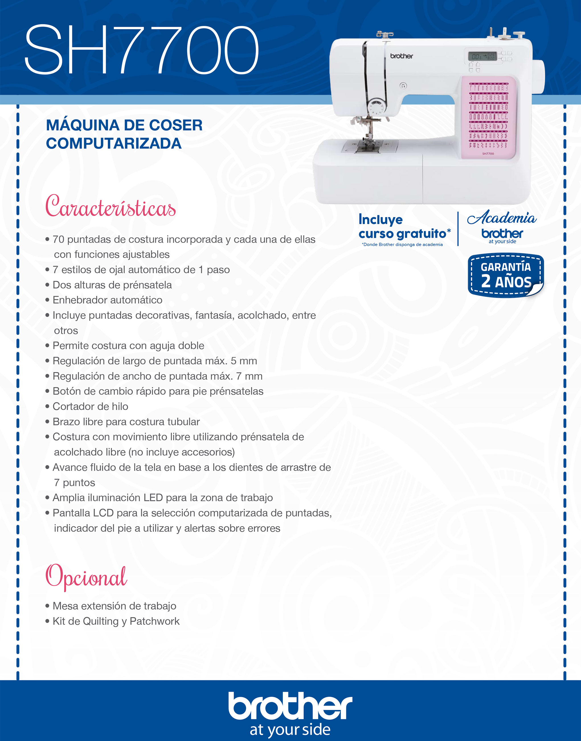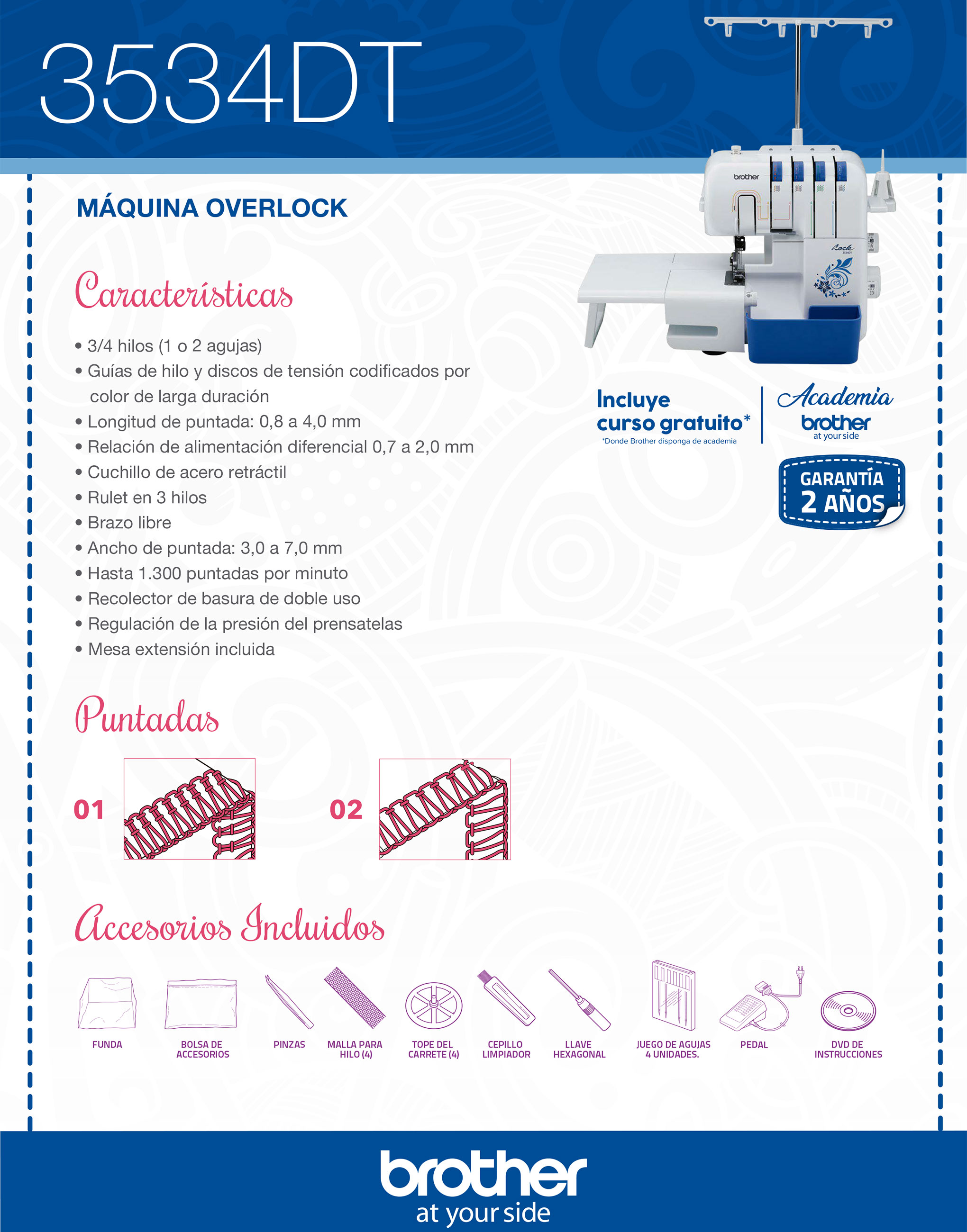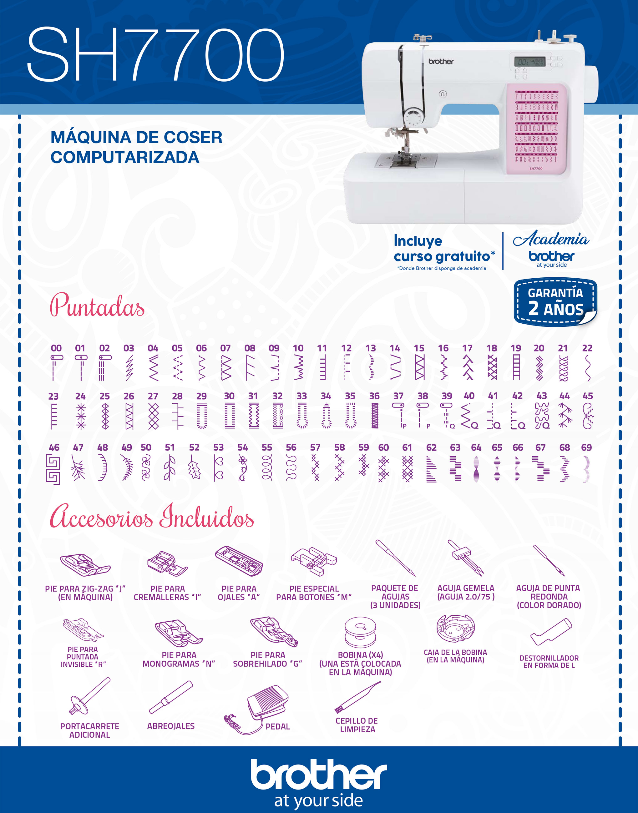 Pie Zigzag "J", Pie Cremealleras "I", Pie Ojales "A", Pie especial Boton "M", Pie dobladillos estrechos, Pie Puntada Invisible "R", Pie Acolchado, Pie Para Acolchado 1/4", Pie Movil, Guia Acolchado, Pie Antiadherente "H", Pie Monogramas "N", Pie Sobrehilado "G", Pie Guia puntada "P", Pie Ajustable Cremalleras o ribetes, Pie Punta Abierta, Carretes para Bobina, Set Agujas, Aguja Gemela (2.0/75), Aguja de punta redonda (90/14), Destornillados, Portacarrete adicional, Pedal, Placa de zurcir, Bolsa Accesorios, DVD, Funda protectora, Mesa extensión, Tapa Carrete , Inserción de carrete de hilo, Abreojales, Lápiz Calador, Cepillo Limpieza. Pie estándar, Funda, Bolsa Accesorios, Pinzas, Malla para hilo x4, Tope de carrete x4, Cepillo Limpiador, Llave Hexagonal, Set Agujas x 4 (130/705, 80/12, 90/14x2pcs), Pedal, DVD Instrucciones, Mesa extensión, Pie Puntada Ciega, Recolector Tela