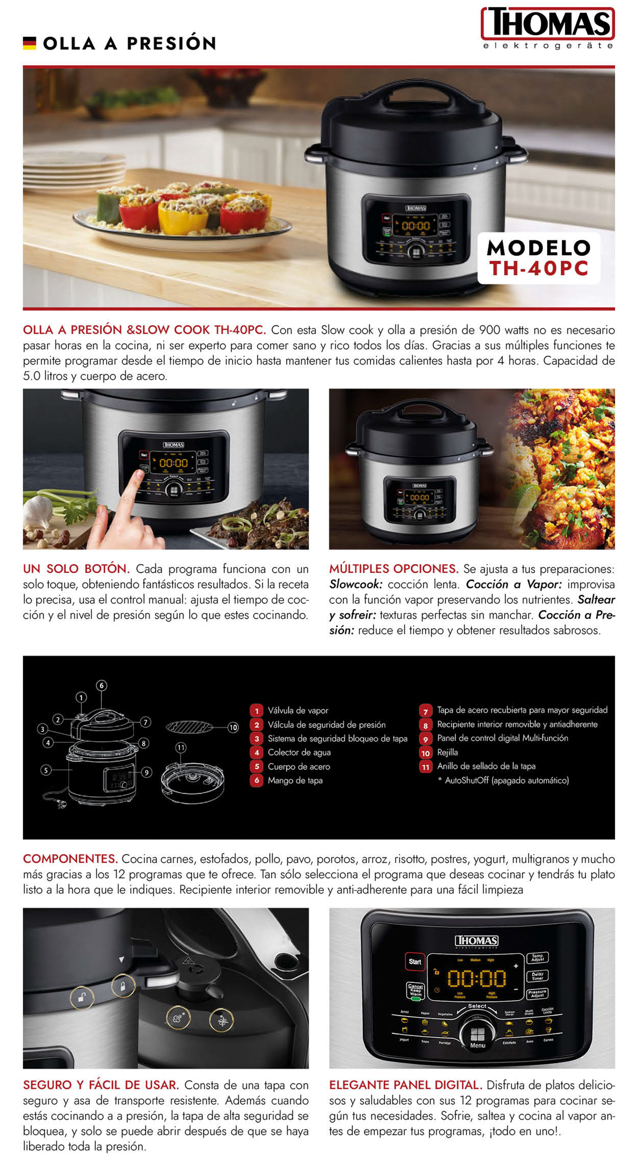 | Descripción de Tecnología | 12 programas para preparar las más exquisitas recetas y todo tipo de alimentos (arroz, yogurt, carnes, pescados, aves, vegetales, etc.) |
