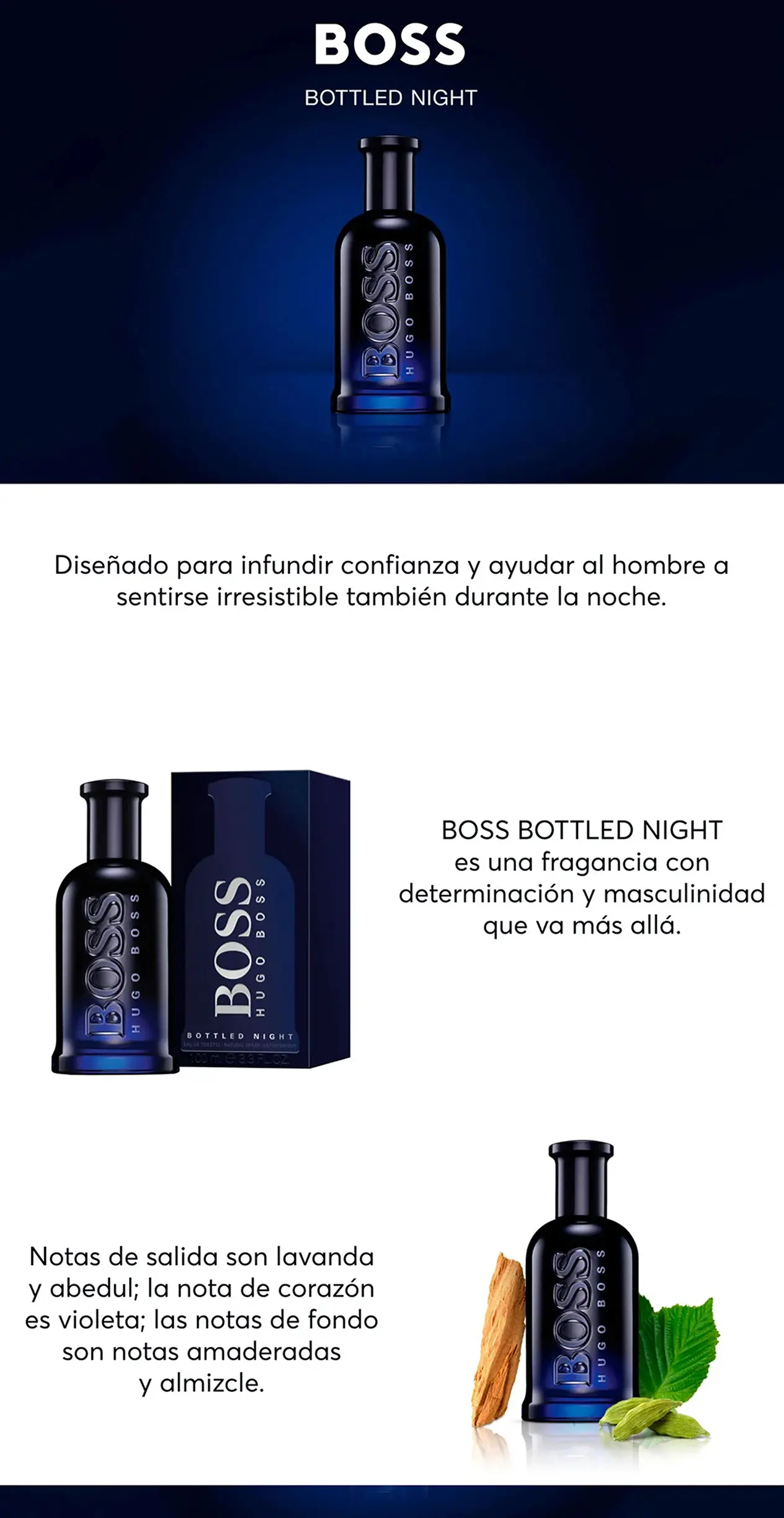 | Más Información | BOSS Bottled Night está destinado a convertirse en el arma secreta en el arsenal de seducción del hombre BOSS: tiene tanto éxito durante la noche como durante el día. El aroma, seductivo, calido y exotico.Una composición única entre elegancia y seducción. Un aroma intenso y especiado con un carácter decidido, vanguardista y masculino. Las maderas son clave en la fragancia: BOSS Bottled Night presenta una réplica aromática de una nueva madera rica y exótica, Louro Amarelo. |