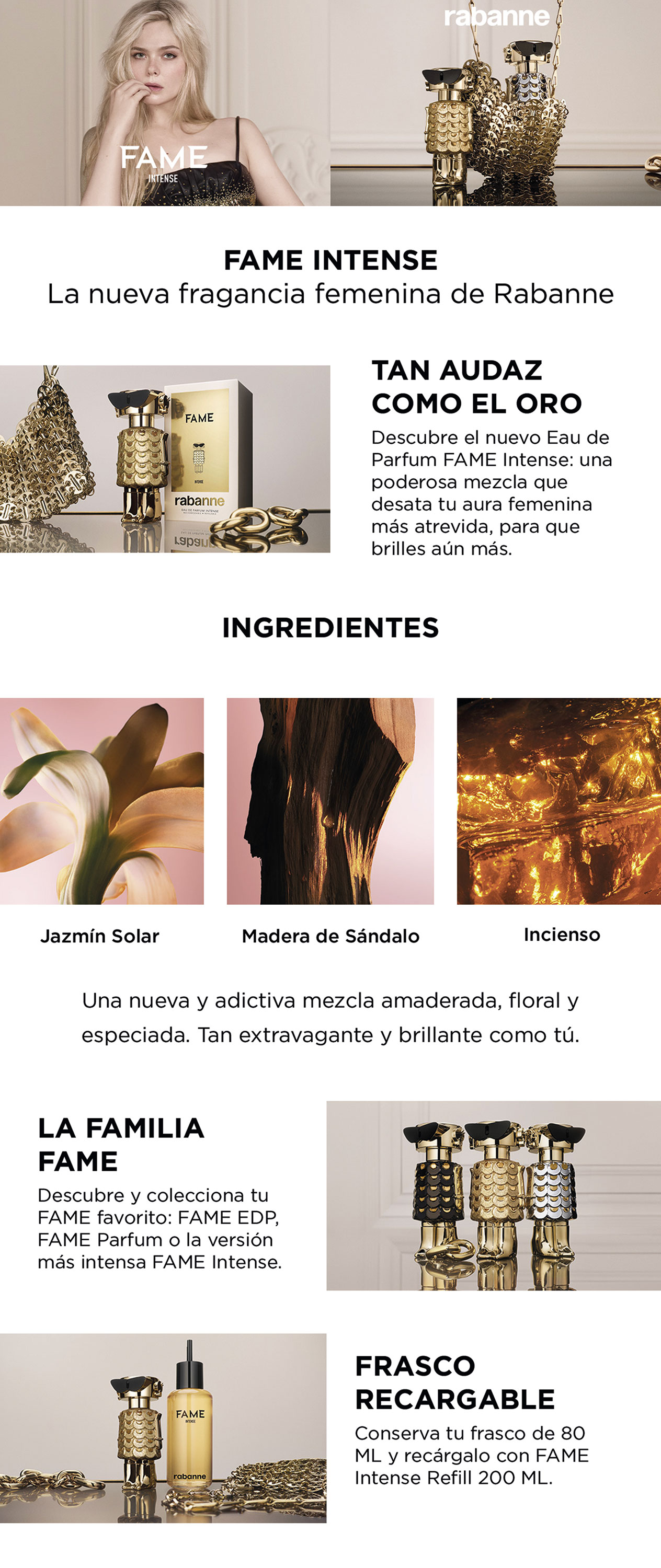 | Más Información | Reclama tu luz interior. El oro brillante es el nuevo atrevimiento. El nuevo FAME Intense de Rabanne desata tu aura femenina más atrevida para hacerte brillar más allá donde vayas. FAME Intense captura el irresistible espíritu parisino de la mujer fiestera y vanguardista, galvanizando una nueva era de feminidad deslumbrante con su luz eterna. Más traviesa. Más irreverente. Ella es más estimulante que nunca. Tiene tanta confianza como audacia y toma decisiones audaces mientras el cielo de París se oscurece. Elaborado sólo con los ingredientes más excepcionales, el jazmín solar se combina con el opulento incienso y el cremoso sándalo en una nueva y deslumbrante fragancia que libera tus facetas más brillantes, iluminando cada habitación y revelando la estrella FAME que llevas dentro. |