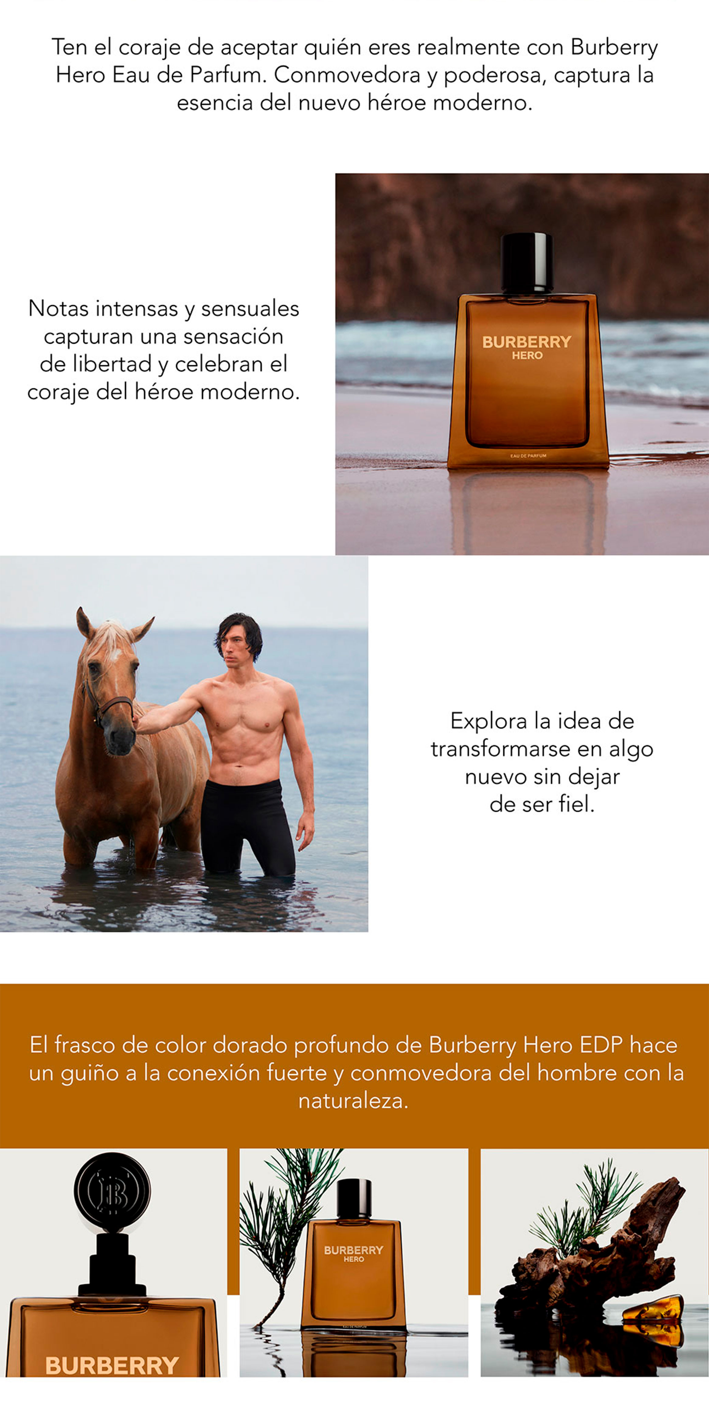 | Más Información | El Eau de Parfum Hero de Burberry explora una nueva y tentadora faceta del heroísmo: el valor de abrazar quién eres realmente. La fragancia cuenta con un trío de aceites cálidos de madera de cedro como base característica, que culmina en un crescendo fresco y luminoso. La vibrante apertura de la aguja de pino se mezcla con el benjuí y el incienso, creando una intensa fusión de profunda sensualidad. Burberry Hero Eau de Parfum explora una nueva y tentadora faceta del heroísmo: el coraje de abrazar lo que realmente eres. Presenta a un hombre en un viaje de autodescubrimiento. Un espíritu explorador, con una sensibilidad centrada. Su energía desprende una tierna conmoción, expresada por la presencia del caballo, una poderosa criatura que representa la fuerza de nuestro héroe. La fragancia cuenta con un trío de aceites cálidos de madera de cedro como base característica, que culmina en un crescendo fresco y luminoso. La vibrante apertura de la aguja de pino se mezcla con el benjuí y el incienso, creando una intensa fusión de profunda sensualidad. Burberry Hero Eau De Parfum es una reimaginación moderna de la fragancia Burberry de Riccardo Tisci. Con el monograma de TB, el frasco se viste de roble profundo y tonos dorados inspirados en los códigos de la casa para expresar la nueva intensidad de la fragancia que contiene. |