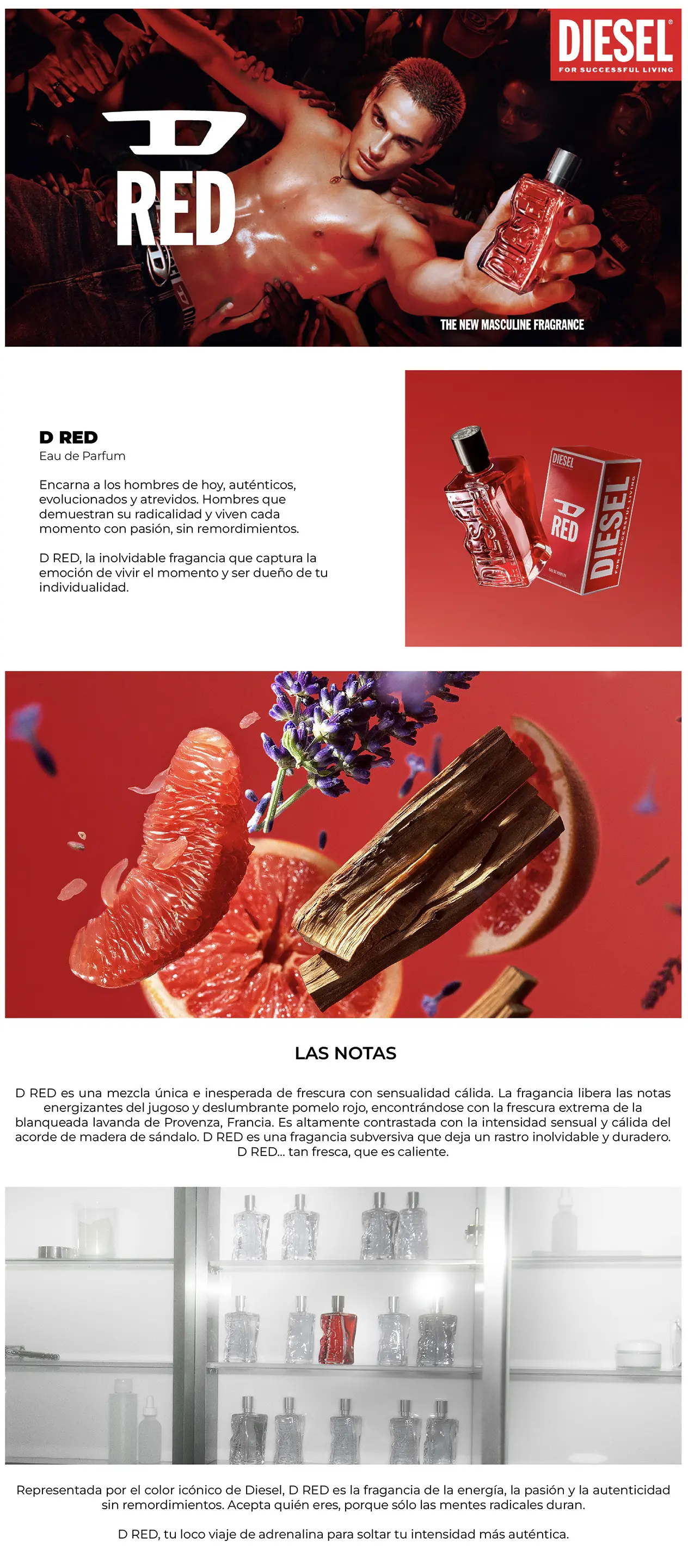 | Más Información | El nuevo aroma de frescura, energía y pasión. Captura la emoción de vivir el momento y ser el dueño de tu singularidad. Una nueva invitación a dejar huella con pasión. El diseño de la botella presenta un toque único que hace eco del logotipo "Diesel For Successful Living", con un toque rojo en la parte posterior de la botella que crea un hipnótico juego de luces rojas en el cristal. |