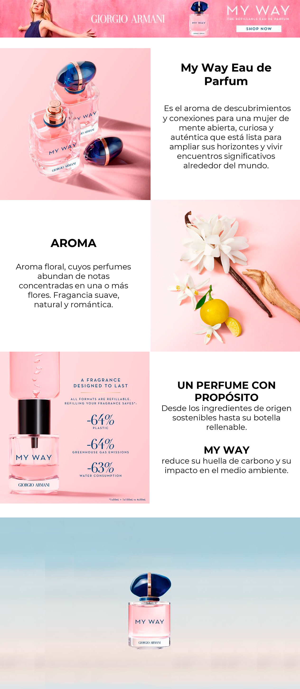 | Más Información | My Way es el aroma de los descubrimientos y las conexiones para una mujer de mente abierta, curiosa y auténtica, dispuesta a ampliar sus horizontes y vivir encuentros especiales en todo el mundo. |
