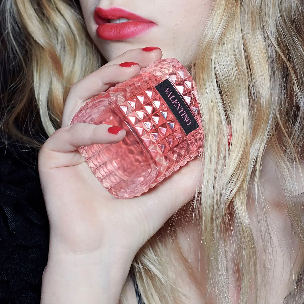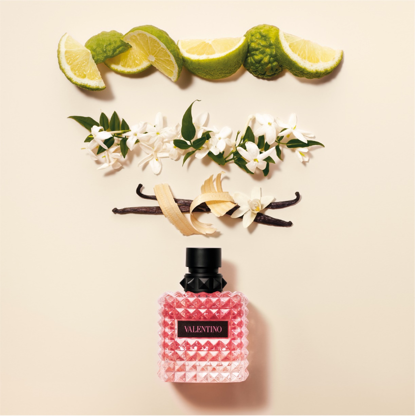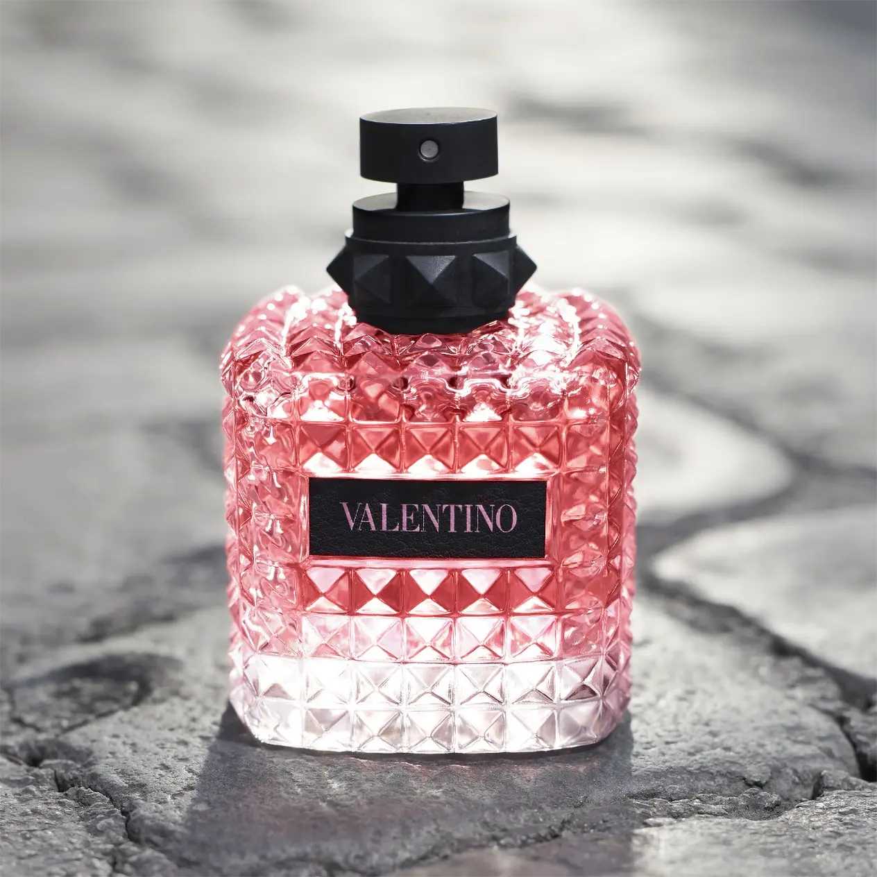 El frasco rinde homenaje al emblemático motivo Valentino Rockstud. Esta pequeña forma piramidal, inspirada en la arquitectura de Roma, es la firma característica de Valentino. El frasco elegante y clásico se reinventa gracias al contraste del cuero negro y el color rosa intenso. En Valentino, el rosa es, además de romántico, arriesgado y atrevido. El rosa es todo un símbolo punk.