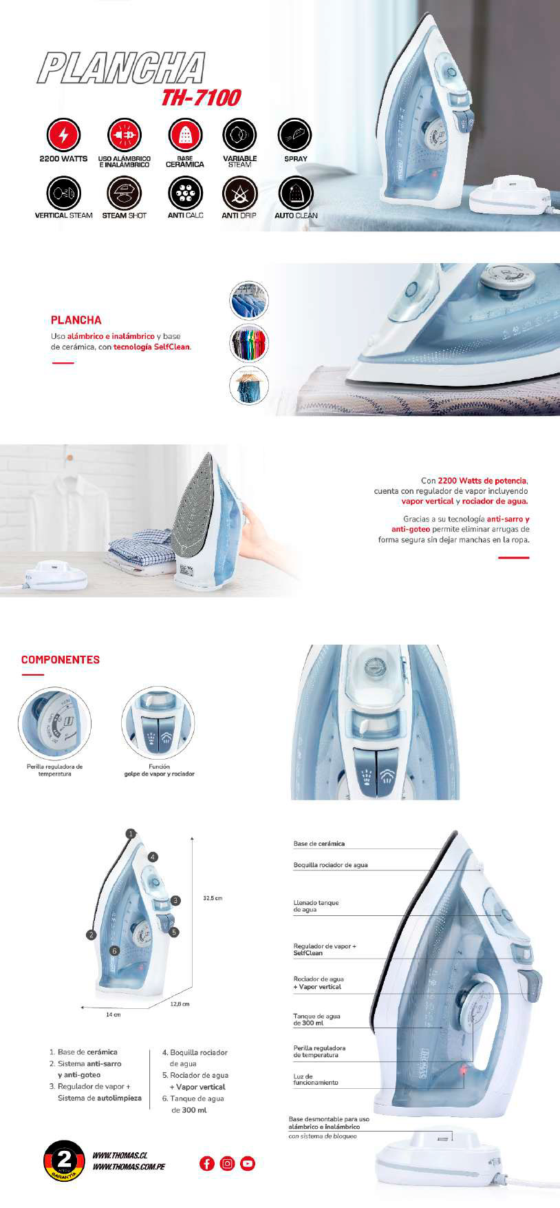 | Instrucciones de Uso | Con 2200 Watts de potencia, esta plancha de uso alámbrico e inalámbrico y base de cerámica facilitará tu rutina de planchado. Diseñada para un planchado rápido, perfecto y eficiente. |