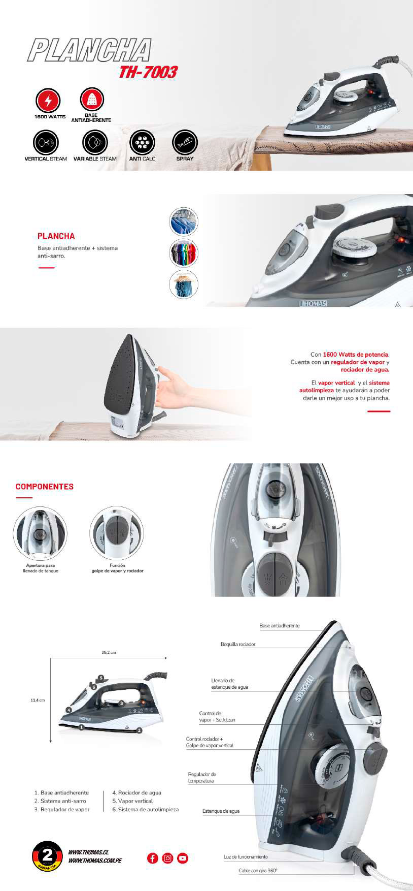 | Más Información | Rociador de agua + golpe de vapor, regulador de vapor + self clean, llenado tanque de agua, boquilla rociador de agua, base antiadherente, perilla reguladora de temperatura, tanque de agua, luz de funcionamiento, cable con giro 360°. |