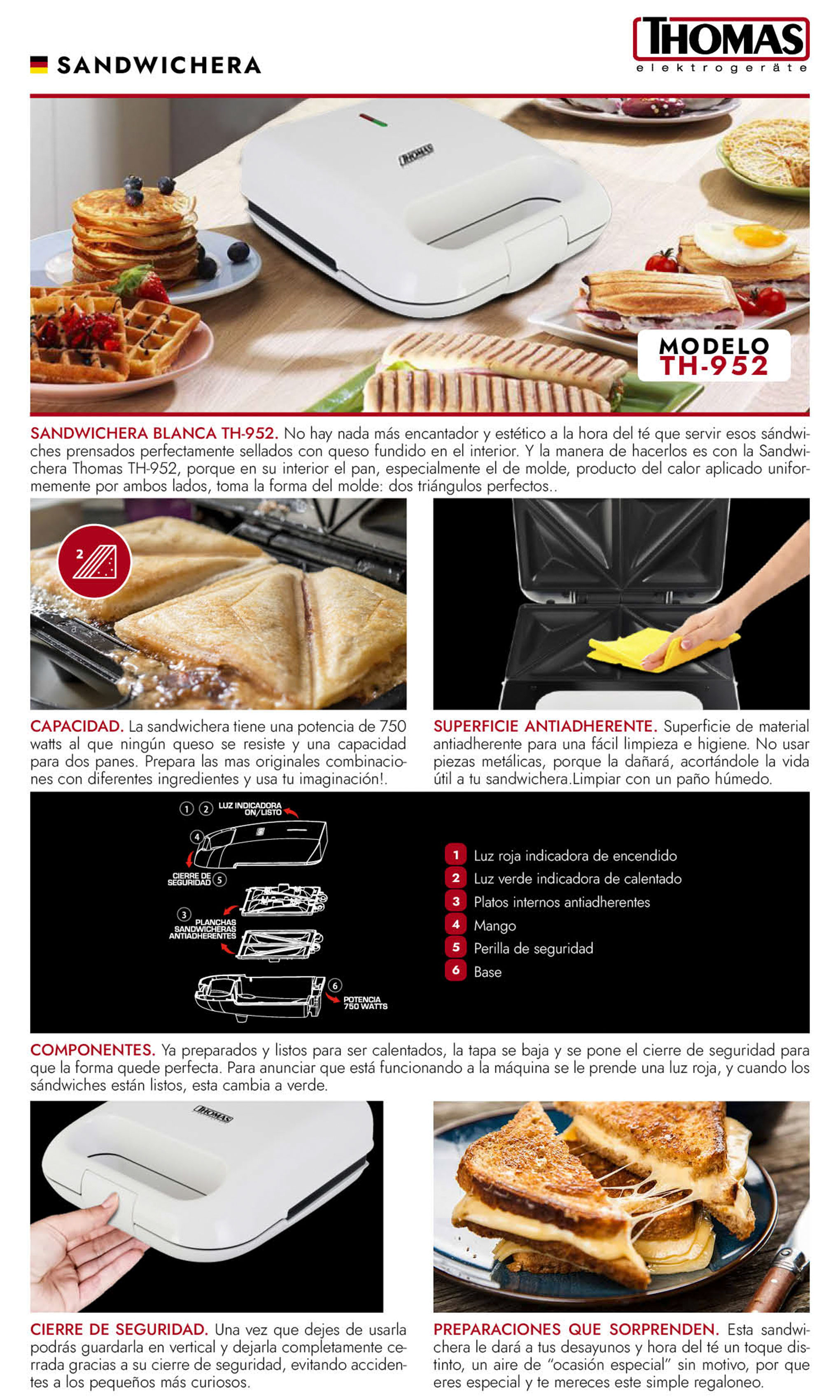 | Más Información | Potencia 750 watts. Capacidad 2 panes. Termostato automático para un resultado óptimo. Luces indicadoras de encendido y listo. Planchas de material antiadherente para una fácil limpieza. Cierre de seguridad. Almacenamiento vertical |