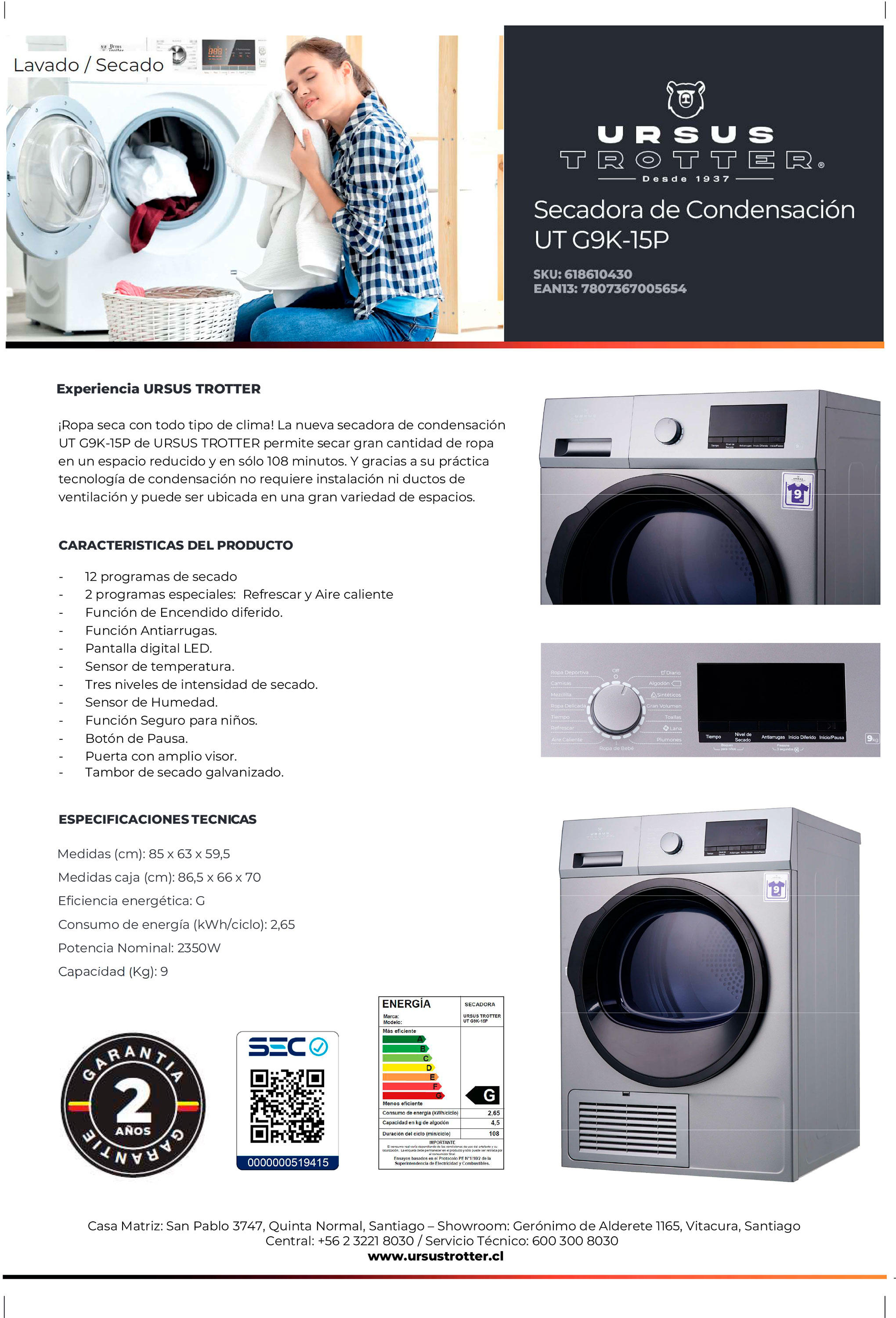 | Más Información | 12 programas de secado 2 programas especiales: Refrescar y Aire caliente Función de Encendido diferido. Función Antiarrugas. Pantalla digital LED. Sensor de temperatura. Tres niveles de intensidad de secado. Sensor de Humedad. Función Seguro para niños. Botón de Pausa. Puerta con amplio visor. Tambor de secado galvanizado. |