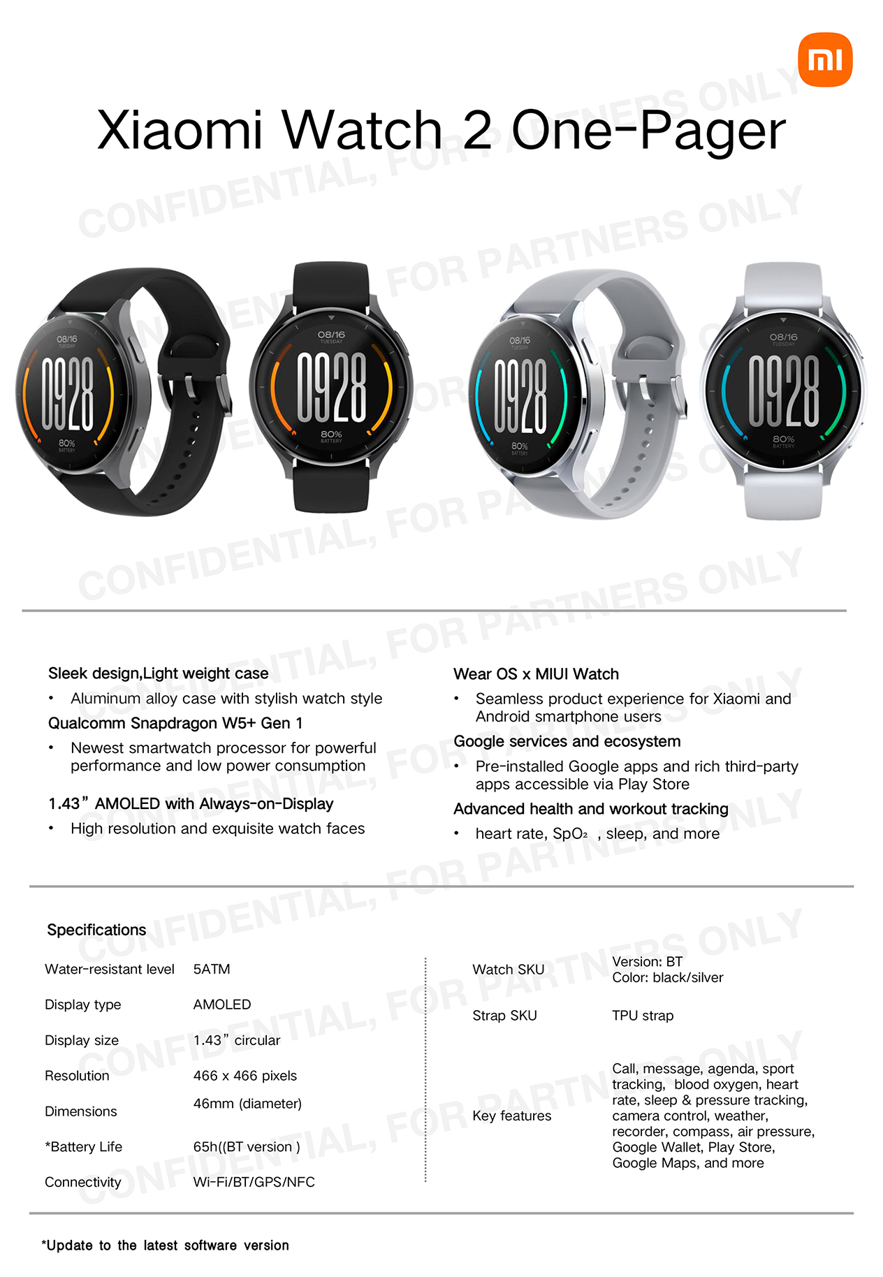 | Más Información | Diseño elegante, estuche liviano Procesador Qualcomm Snapdragon W5+ Gen 1 Pantalla AMOLED de 1,43” siempre activa Wear OS x MIUI Watch Servicios Google y ecosistema Seguimiento avanzado de salud y entrenamiento |